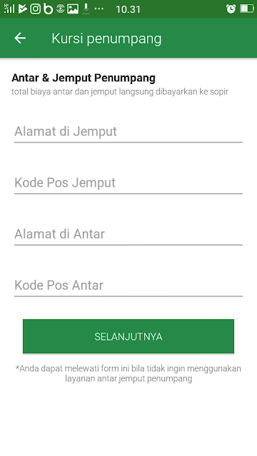 Selanjutnya akan muncul halaman Antar dan Jemput penumpang. pada halaman ini, Anda bisa mengisi alamat penjemputan jika memang Anda meginginkan untuk di jemput di tempat Anda. untuk Antar dan Jemput penumpang akan di kenakan biaya dan langsung membayar pada Sopir. jika Anda tidak ingin di Antar atau di Jemput, silahkan kosongkan kolom isian dan klik selanjutnya.
